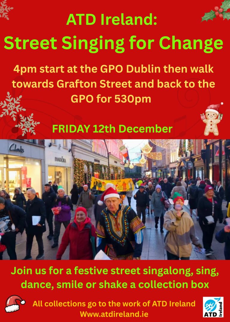 We welcome you all to join us at 4pm at the GPO as we walk up to Grafton Street and back Singing Festive Songs and collecting for ATD Ireland.