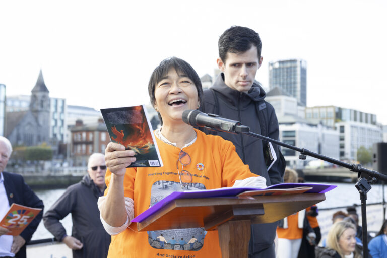 Throughout the ceremony, powerful and emotional testimonies echoed from individuals and groups who know poverty first-hand. Participants included members of ATD Ireland, the Dominican Justice Office Young Mother’s Network (YMN), Pavee Point, Exchange House Ireland, Matt Talbot Community Trust, Westcourt Justice Centre Belfast and Merchants Quay Ireland. We heard stories of coming through addiction, the poverty faced by the Traveller Community, living in direct provision, mental health and more. We heard how people give back to their communities despite experiencing real hardship and the speakers shared through poetry and creativity. Some speakers have been present at 17th October for almost all 25 years and spoke about the importance of it and the poverty stone. Each voice brought stories of struggle, resilience, and hope.