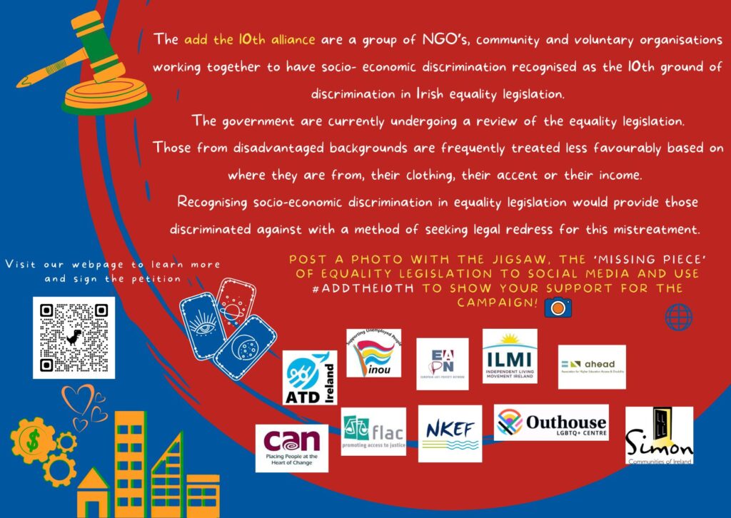 ATD Ireland are part of an alliance called #addthe10th. The purpose of this group is to have socio- economic status recognized as the tenth ground of discrimination in Irish equality legislation, namely the Equal Status Act and the Employment Equality Act. The add the tenth alliance is made up of